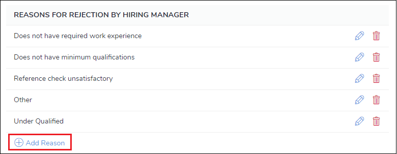 You can also add disqualify reasons directly to the desired category. Click on (+) Add Reason which is present below the rejection reasons list.