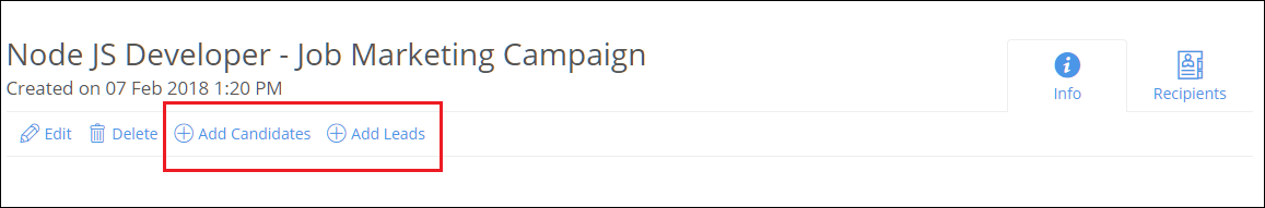 2. Go to the Recipients tab. Click on (+) Add Candidates or/and (+) Add Leads button in the Recipient List panel