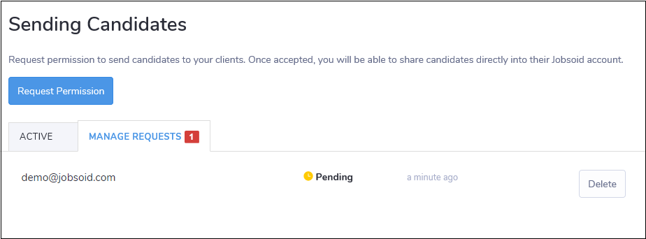 All the requests will be shown under the Manage Requests tab under Sending Candidates section. You can delete your request any time by clicking on Delete button.