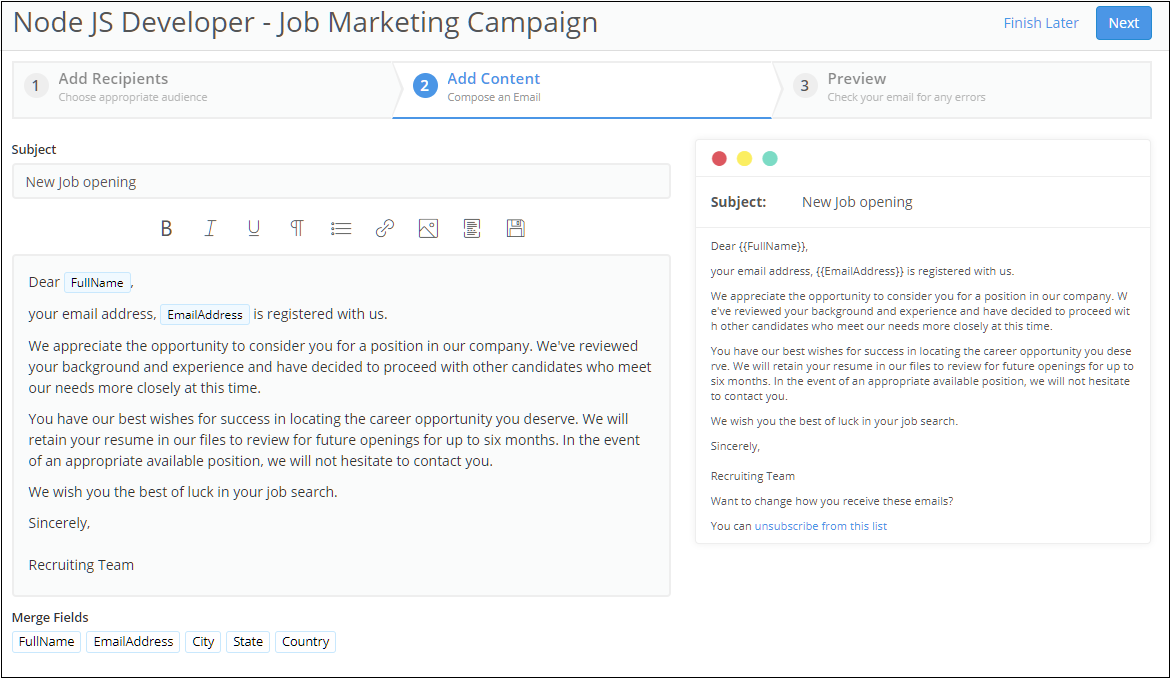 Reach out to your active as well as passive candidates seamlessly with the help of campaigns. You can create a campaign for sourcing impressive candidates or a message about the job vacancies or simply, your company newsletter.