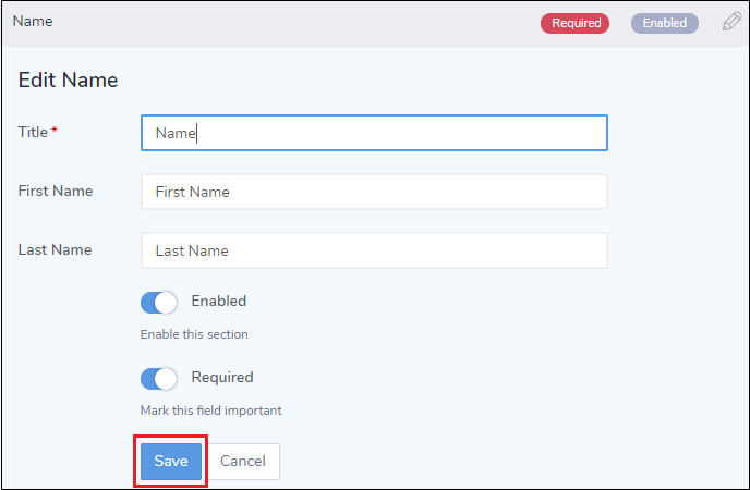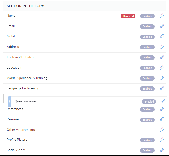 6. By default, all the sections in the form are enabled. If you do not want certain sections to be displayed on your application form, you can disable them by clicking on the Edit icon and turning Enabled toggle to OFF