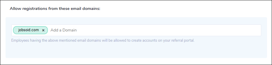 As the name suggests, Jobsoid offers you complete control over who signs up for your candidate referral program. You should list down the email domains in the below text box to allow their registrations.