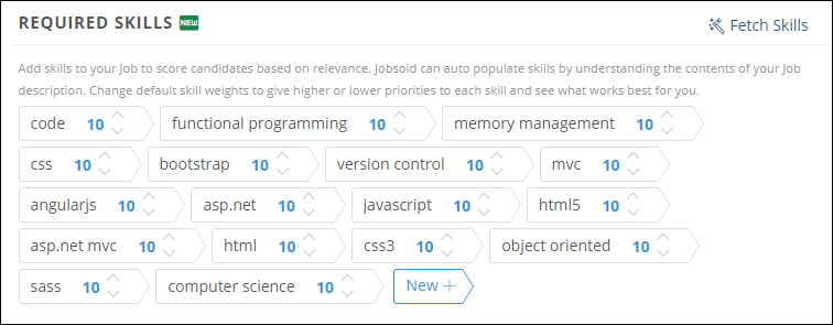 4. To add the skills manually, click on New + in the Required Skills section. It will turn into a text-box upon clicking. Write the desired skill in the text box and hit the enter button. The new skill will be added to the list with a default score of 10. You can either increase or decrease the score as per your requirements.