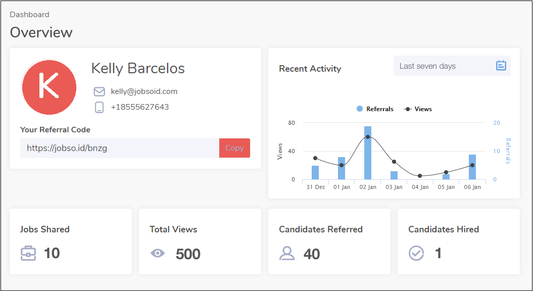As the name suggests, the four cards - Jobs Shared, Total Views, Candidates Referred and Candidates Hired, give you the exact figures of each respectively.