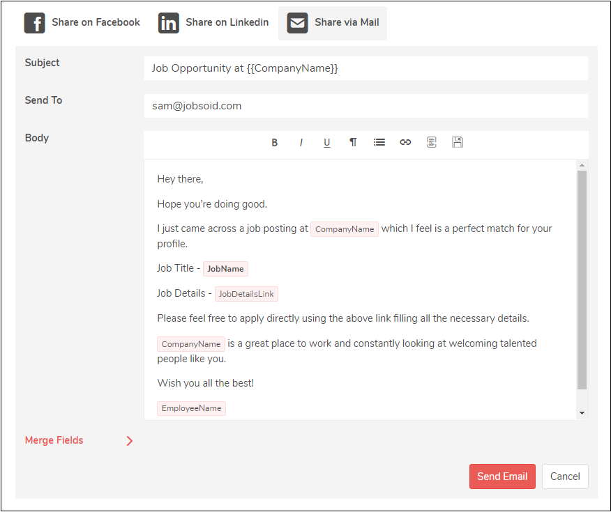2. Talent In Cloud allows you to share your jobs on your Facebook profile, Facebook pages (if any), your LinkedIn profile, your Twitter profile, and via an email