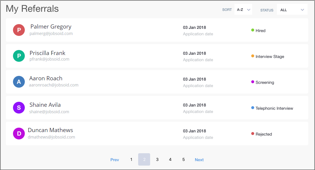 As the name suggests, you can view the list of all the candidates you have referred for the job positions. You can view the status of the applications of referred candidates anytime. You can also sort the candidates based on their application date or name.