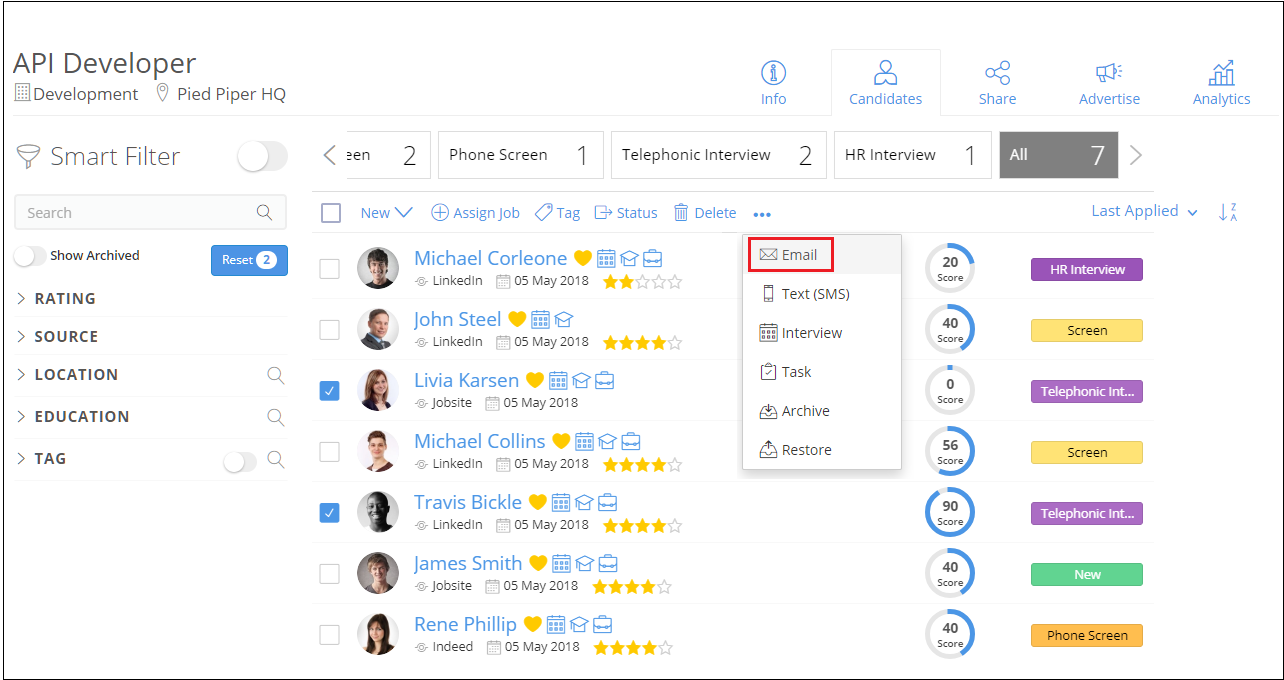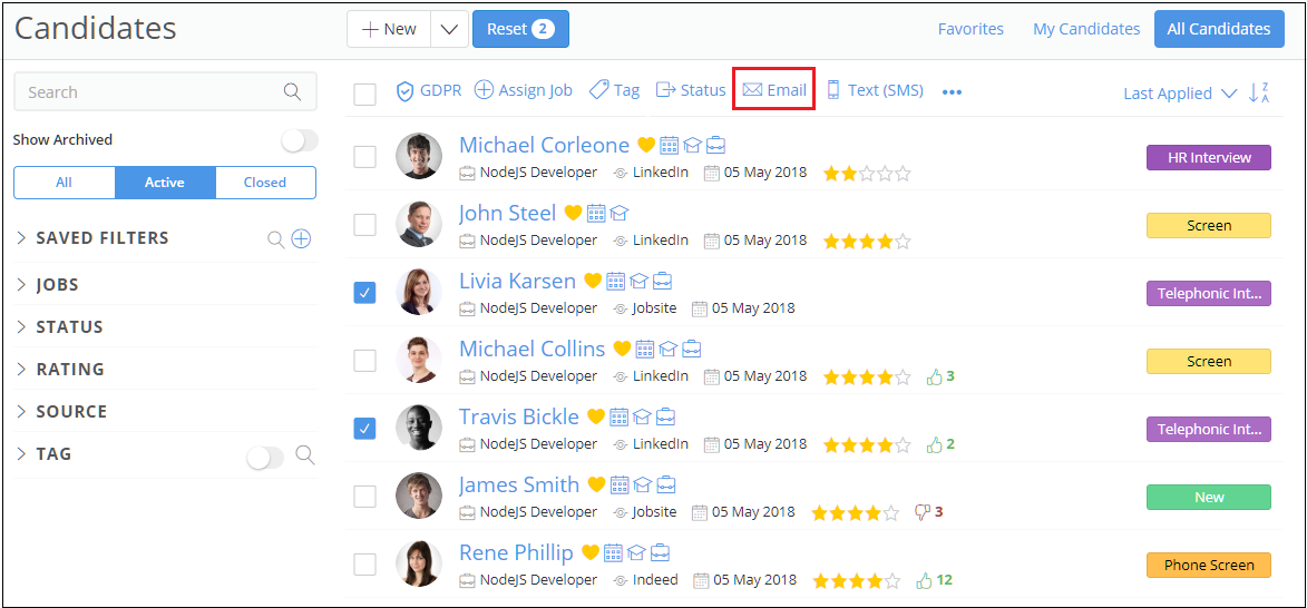 3. Click on the desired stage and select the desired candidates by clicking on the check-boxes