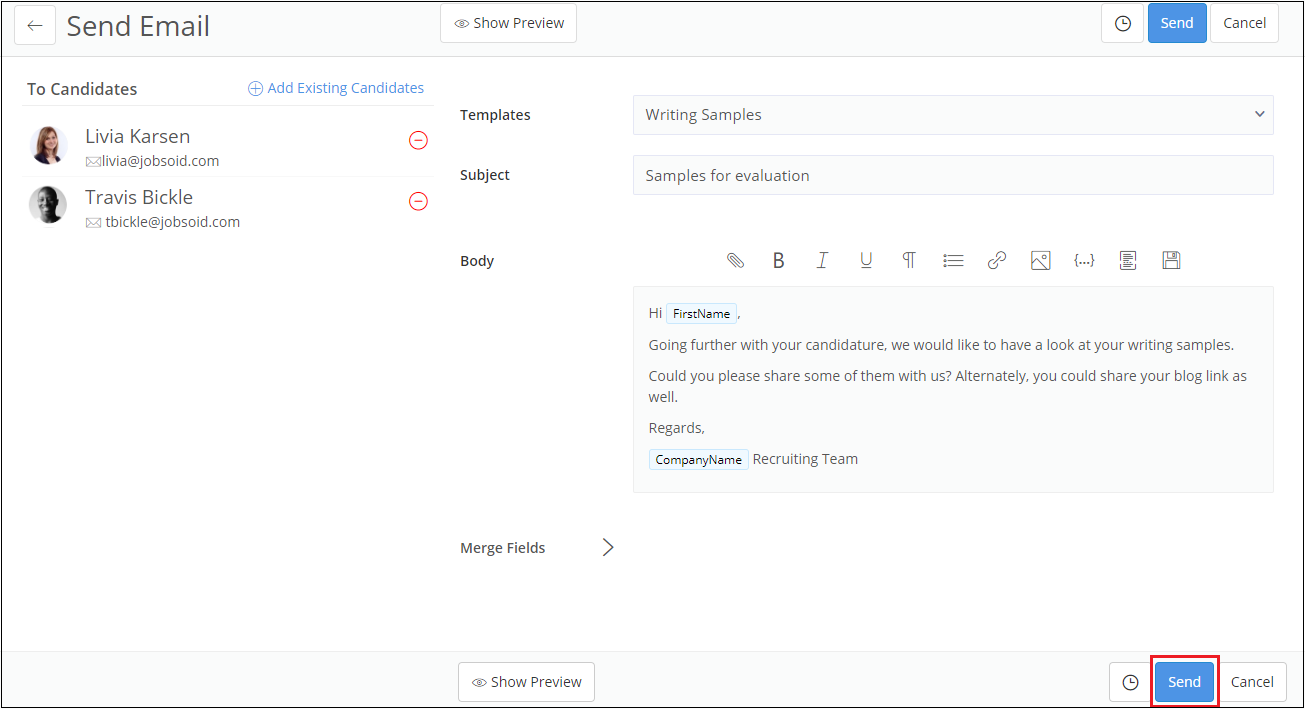 The Send Email page basically contains your recipient list and a mail composer. The left side of the page will show you the list of selected candidates while the right side is the email editor. You can add more candidates to the recipients' list by clicking on (+) Add Candidates and delete them by clicking on (-) icon