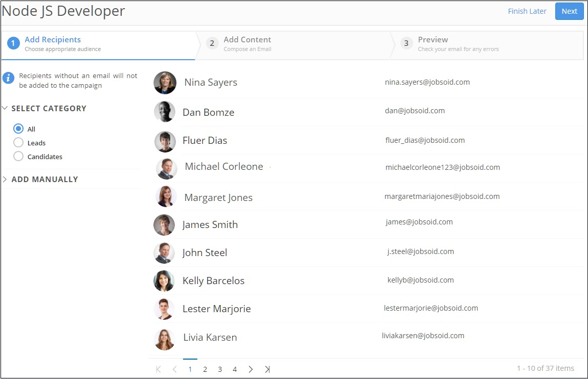 Talent In Cloud allows you to send emails to multiple candidates at a time. It can be done in three ways: