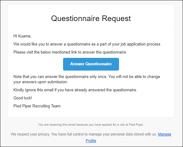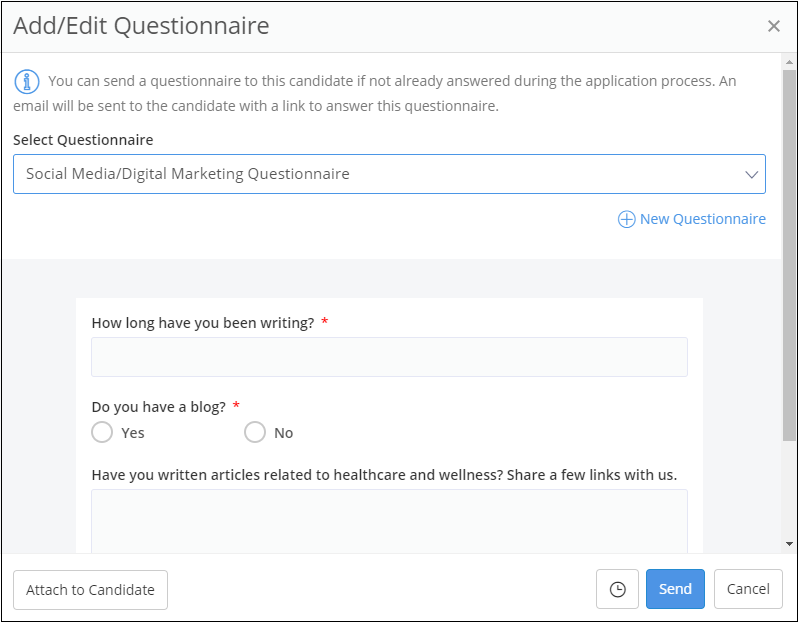 Talent In Cloud allows you to capture your candidate's responses to job-specific questions with the help of questionnaires. You can attach a questionnaire to a job opening and capture their responses at the time of job application or you can send it to them at a later point in time.