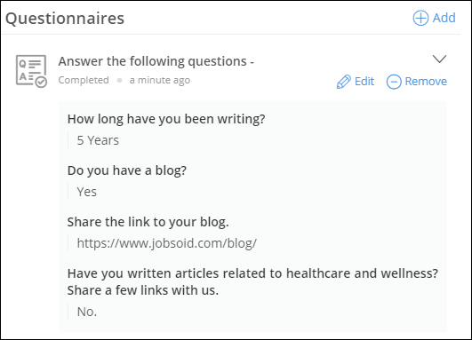 3. Go to Questionnaires section on the candidate profile and click on (+) Add. This will open Add Questionnaire window